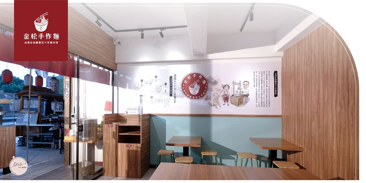 台中「金松手作麵」復刻新創爺爺的台南「老兵麵店」,進駐台中中興大學商圈!本案從空間規劃到施工、品牌CIS廣宣品完整一條龍服務,協助文青創業! 牛肉麵店舖設計 餐廳店面設計